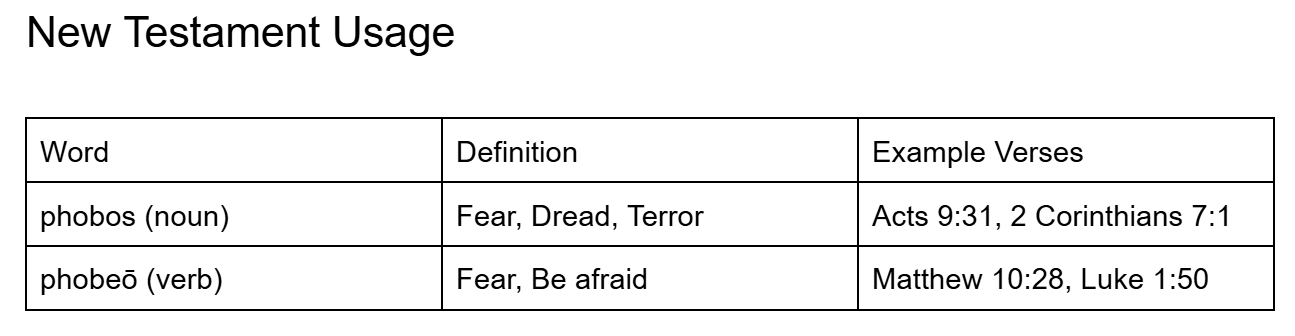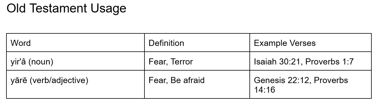 The original written language of the old and new Testament are Hebrew and Greek respectively. The following sections examine the Hebrew and Greek words which are translated to fear.